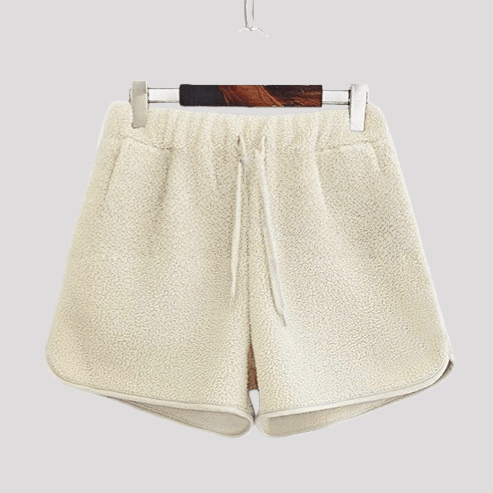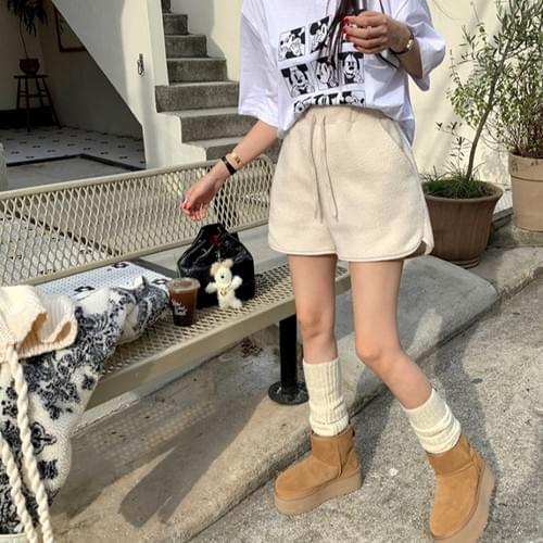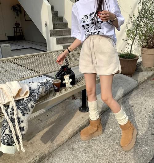 特點:蓬鬆羊羔絨面料/高腰抽繩設計/微寬鬆修飾版型